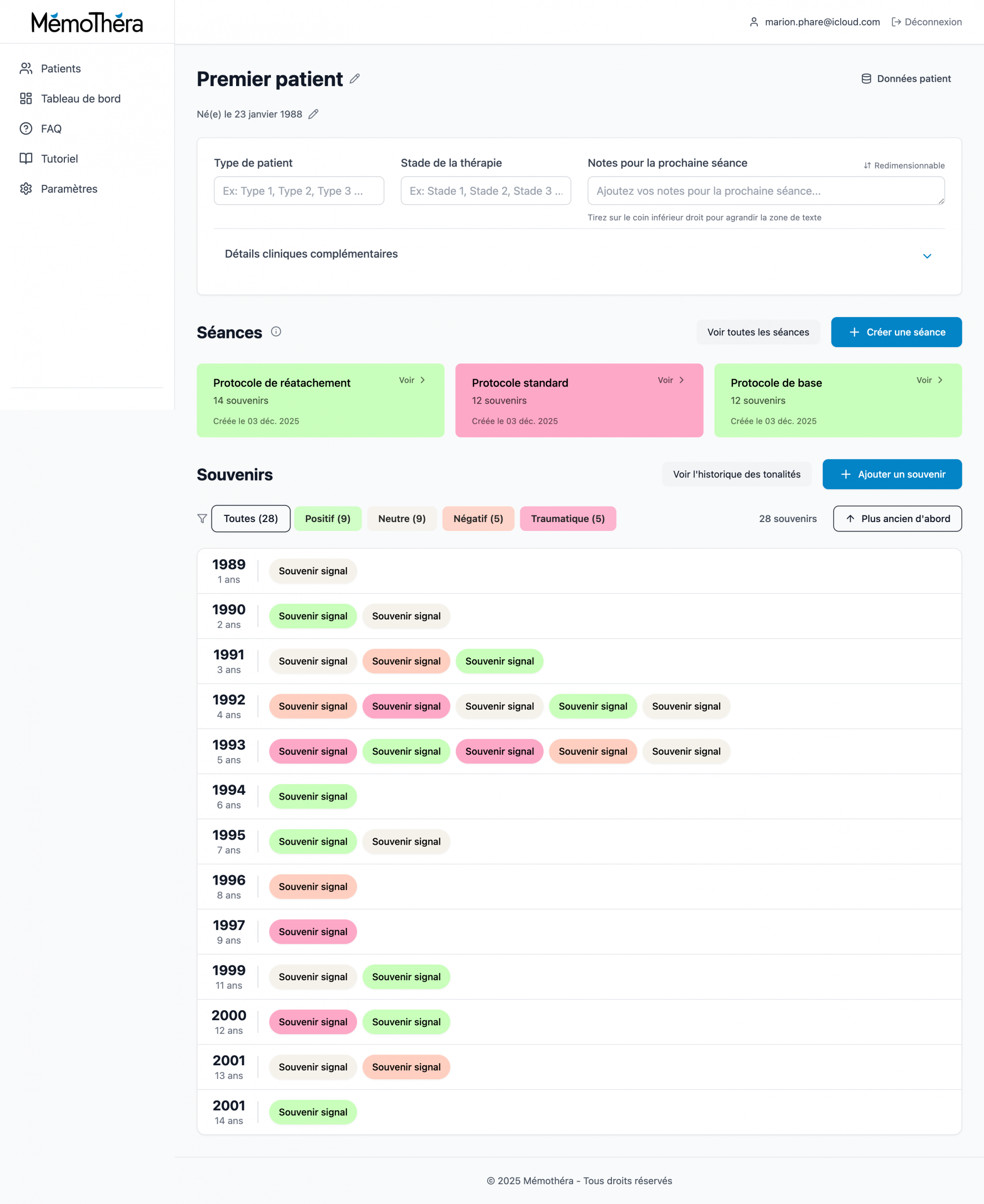 Cette synergie entre l’expertise métier et la conception produit a guidé chaque choix : centralisation des souvenirs, suivi des tonalités émotionnelles, structuration des protocoles, vision longitudinale de la progression des patients.